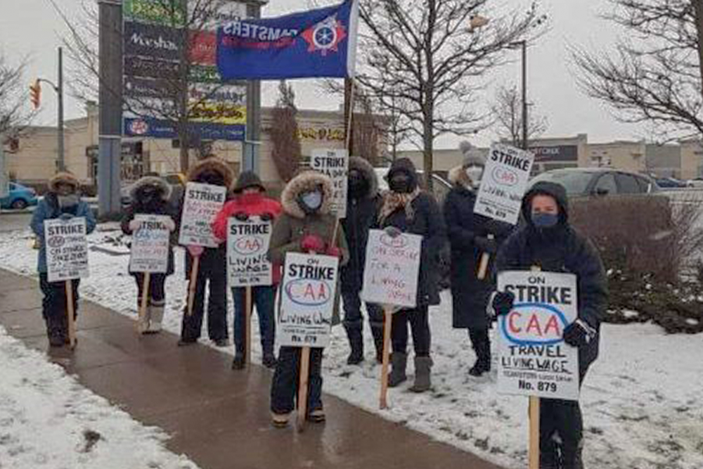 The work stoppage began on Oct. 29, when 18 CAA workers walked off the job in London, Kitchener, Waterloo, Guelph and Cambridge over two key issues: wages and workloads. Teamsters Local 879, which represents the workers, says its members at the CAA—a non-profit organization that offers roadside assistance, insurance, travel and other services—are overworked and underpaid. This workforce, comprised largely of women, has experienced drastically heavier workloads during the pandemic due to staffing shortages and are being asked to work at other stores and departments without compensation.